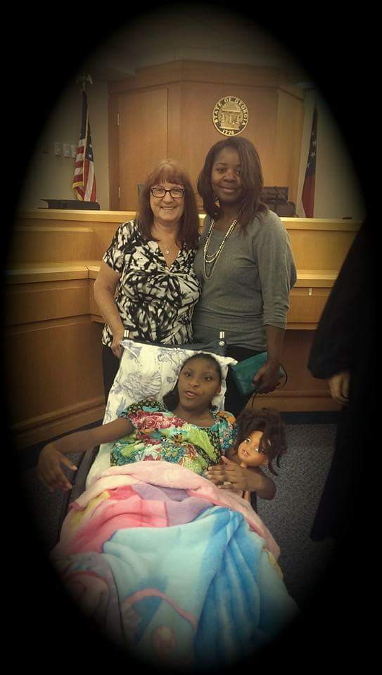 Lizzie was born with a chromosomal abnormality and has severe special needs. She was abandoned at birth, without even a name. The nurses dubbed her “Elizabeth” and we affectionately call her Lizzie. My friend Jeanie fell in love with Lizzie the moment she met her, the day she arrived at My House at two weeks of age. Jeanie was Lizzie’s devoted caregiver throughout countless hospitalizations, and visited her nearly every day of the five long years she lived at My House. Jeanie and her husband tried to adopt Lizzie in 2006, but through a very unfair and unfortunate series of events, they were denied. Instead, Lizzie was placed for adoption with a couple who abused and neglected her for seven years. Horrible things happened to Lizzie during that time, many of which we’ll never know because Lizzie cannot talk. One of many ways Lizzie suffered is that her femur was broken at the hands of her adoptive “mother.” She now has permanent bone/muscle damage and deals with pain on a daily basis. Lizzie is currently in a body cast, after spending nearly a week in the hospital following a surgery related to her broken leg that was never addressed properly by her previous adopters. Many, many people have let this child down — her birth mom, her first adoptive family, DFCS, and other agencies who should have helped but only caused more hurt. All the while, Jeanie never wavered in her love and devotion to Lizzie. She continued to care for her throughout all of those years when Lizzie had been forgotten by everyone else who was supposed to love and protect her.